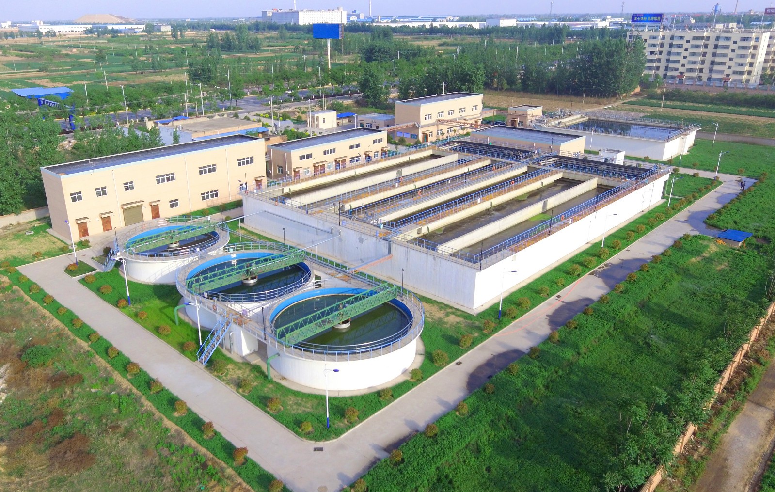 大荔县城区污水处置惩罚厂位于县城东南1公里处,,,效劳人群约15万人,,,项目总投资1.43亿元,,,设计日处置惩罚污水3万吨,,,占地面积82.5亩,,,其中绿化笼罩率达46.8%。。。